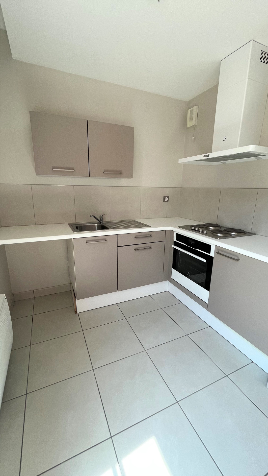 entrée avec placard, cuisine équipée (four, plaques, hotte, frigo et éléments), pièce principale, salle de douche aménagée avec meuble vasque et toilettes.