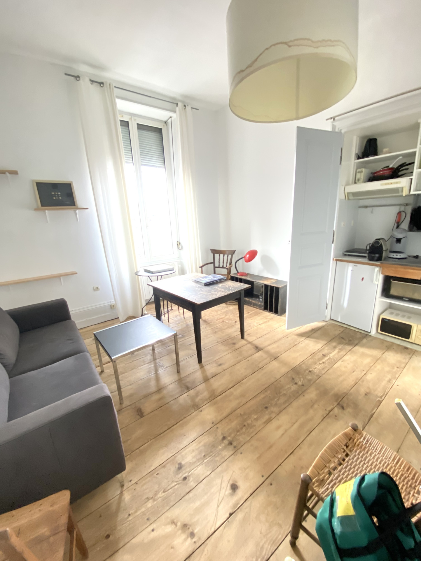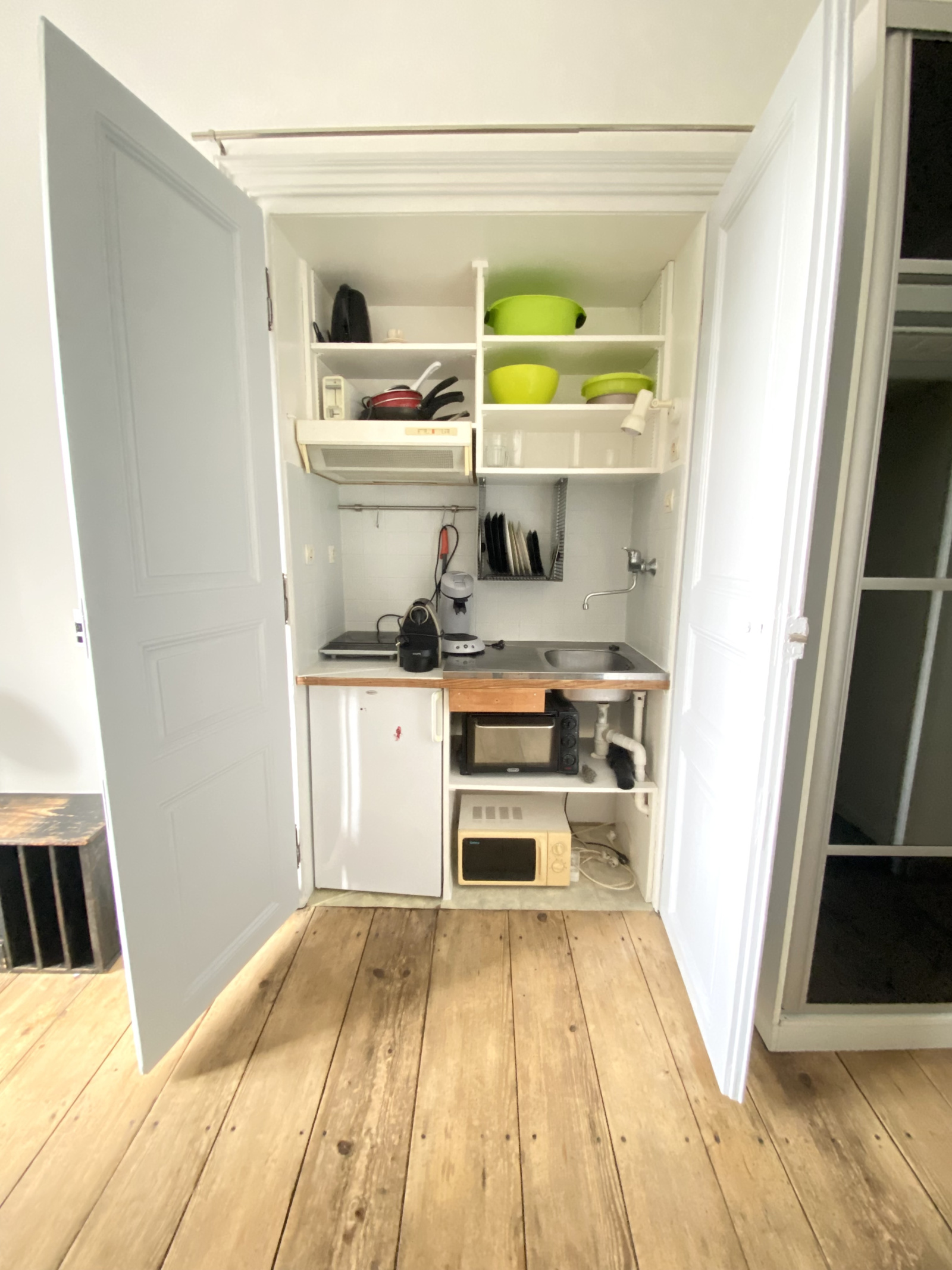 entrée sur pièce principale avec placard et lit mezzanine, kitchenette équipée (mini four, plaques, hotte, petit frigo, micro-ondes et éléments), salle de douche avec toilettes.