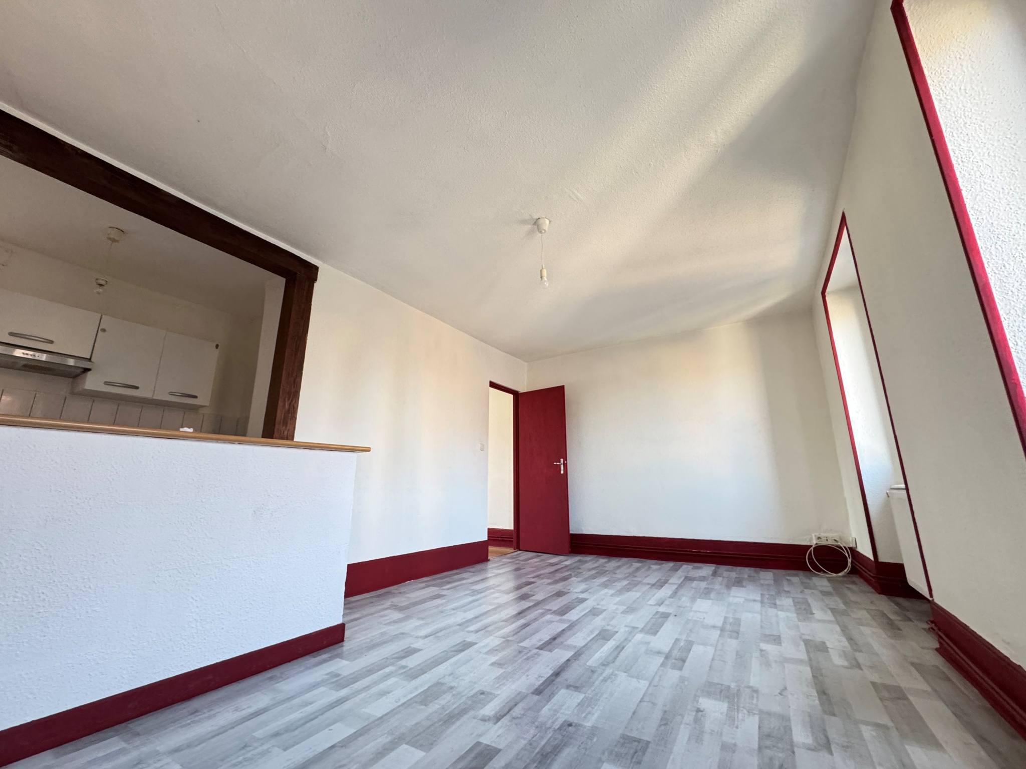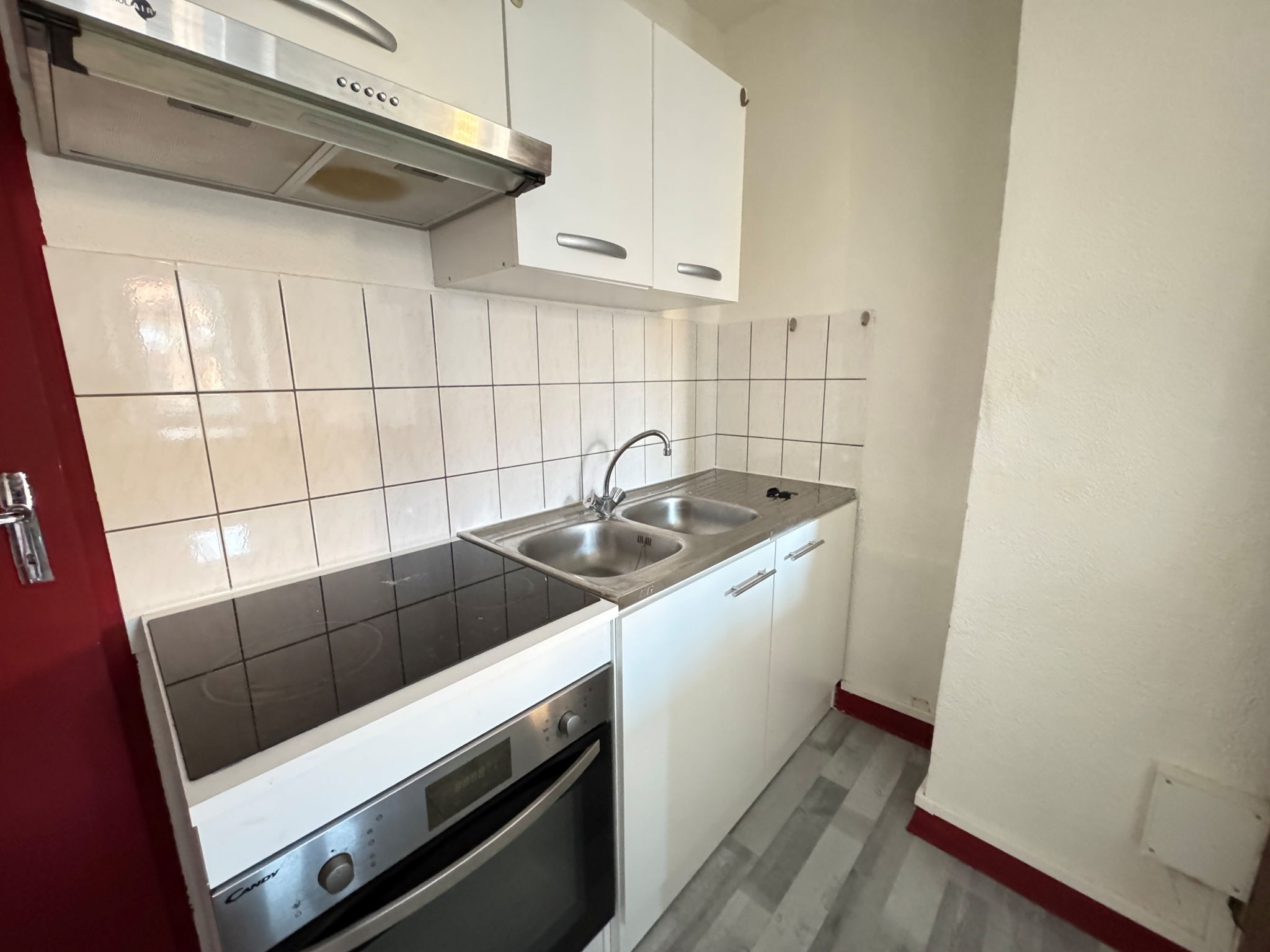 entrée sur séjour, cuisine équipée (gazinière, hotte et éléments), chambre, salle de bains avec lave-linge et toilettes.