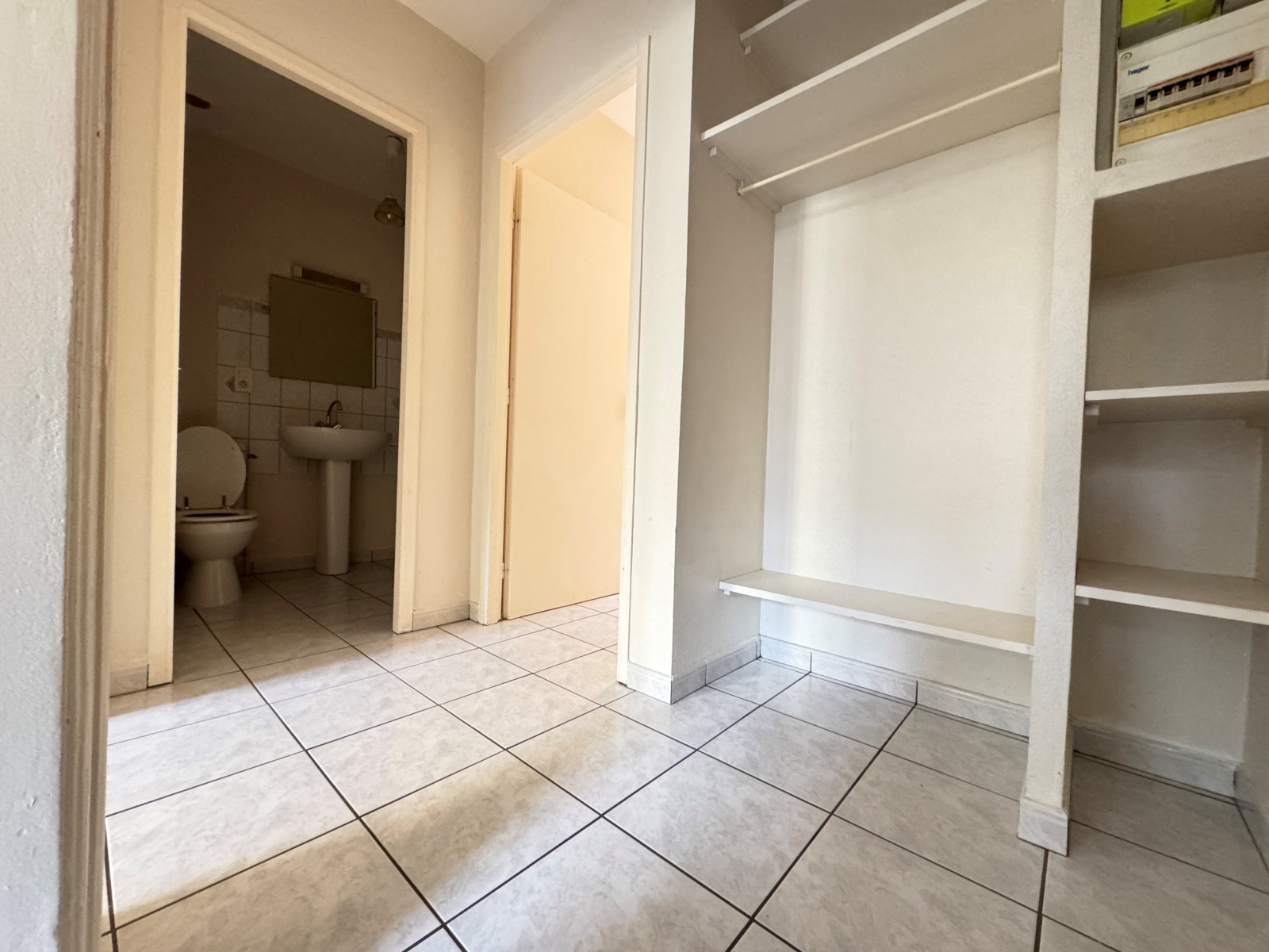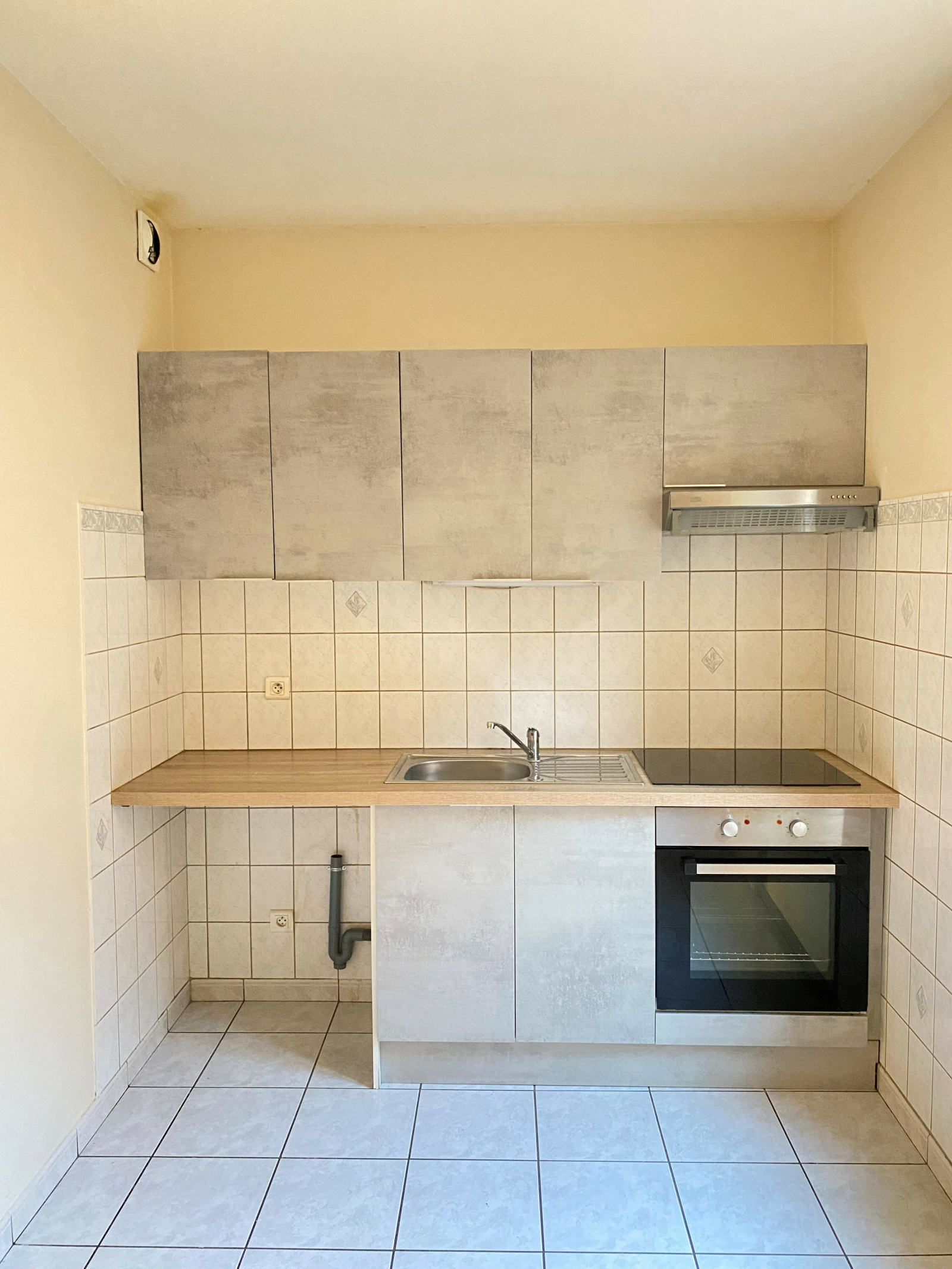 entrée, cuisine équipée (four, plaques, hotte et éléments), séjour, chambre, salle de douche avec toilettes.