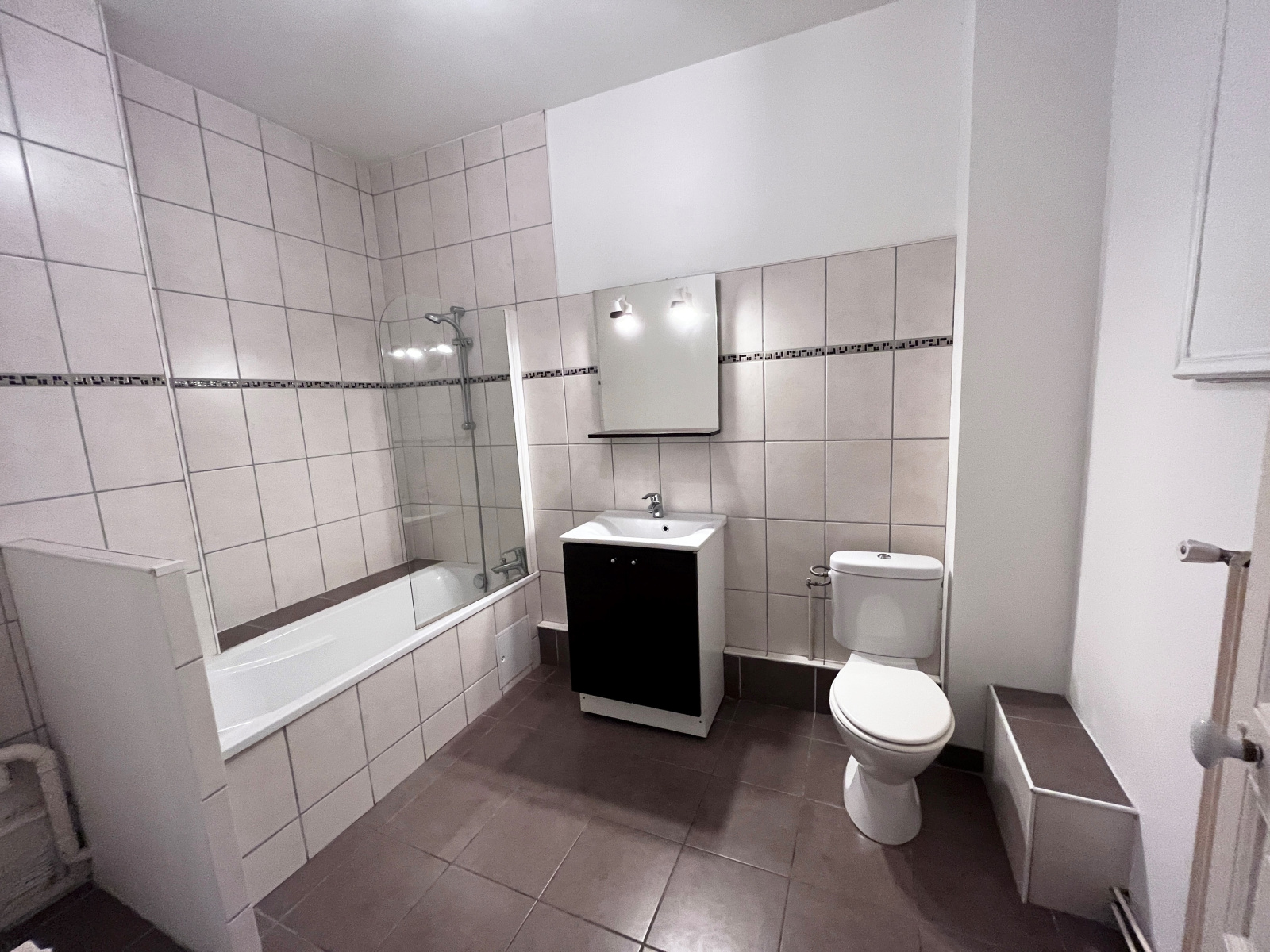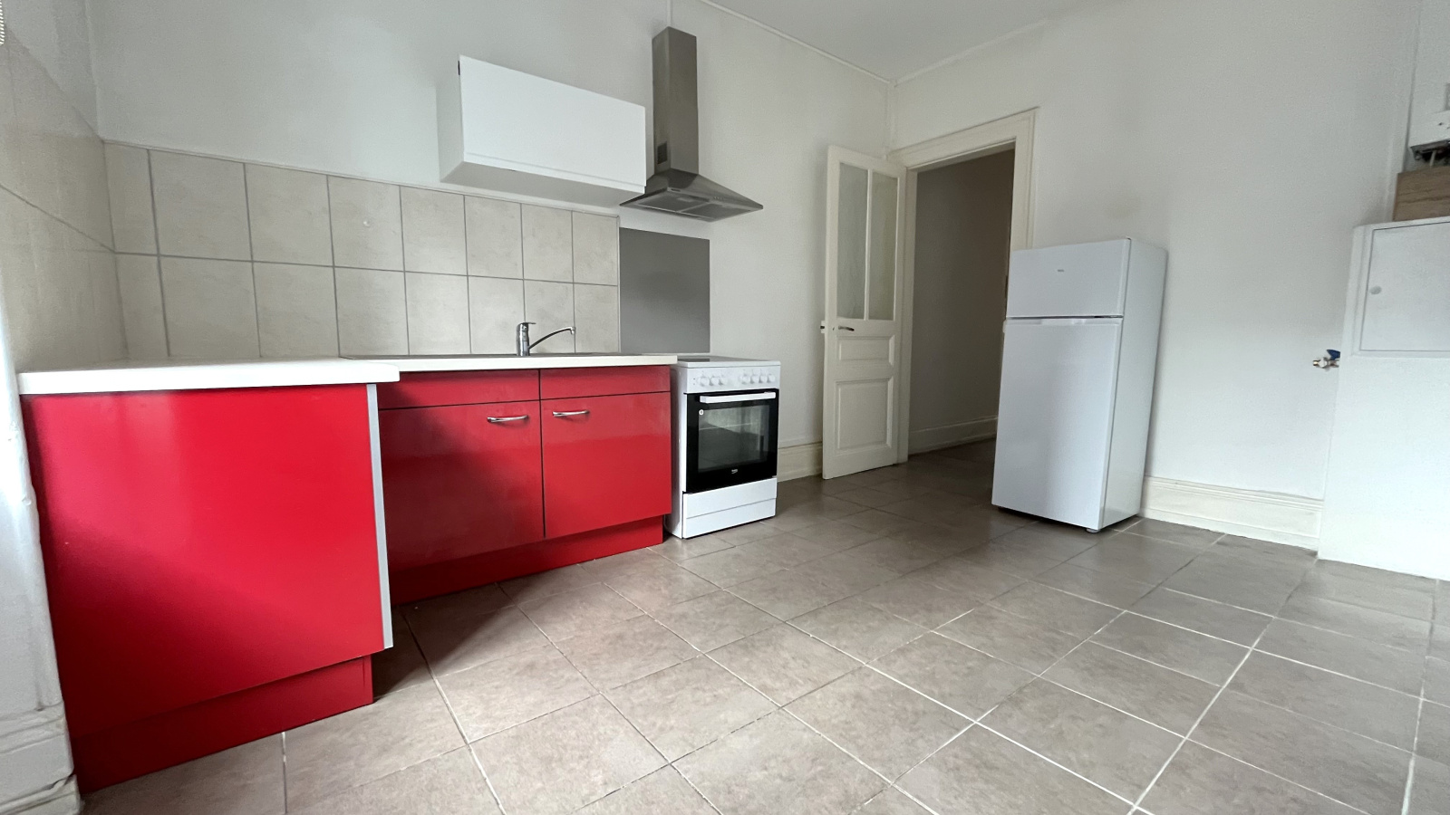 entrée, cuisine indépendante équipée (four, plaques, hotte, frigo et éléments), séjour, chambre, salle de bains aménagée avec meuble vasque et toilettes.
