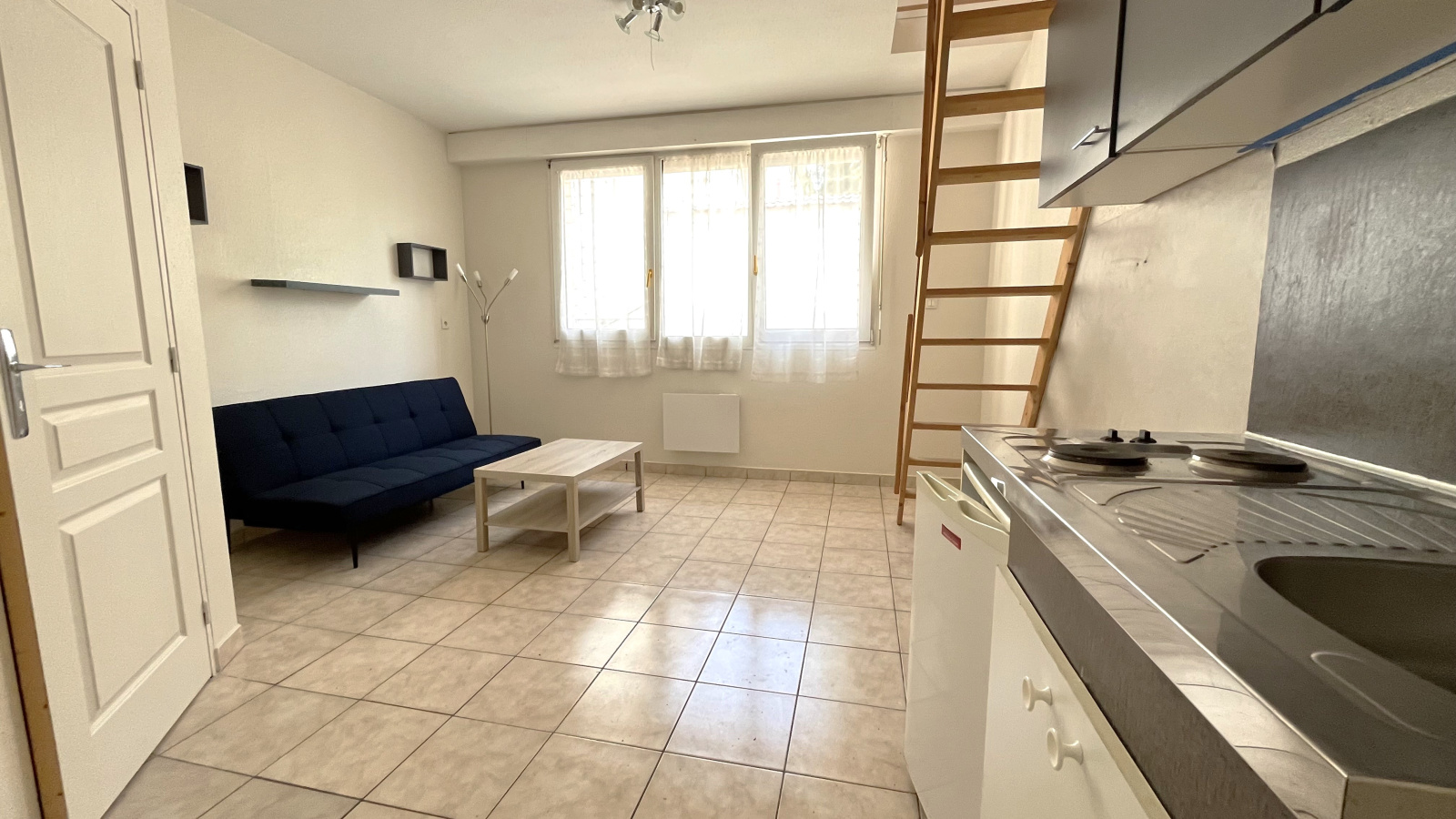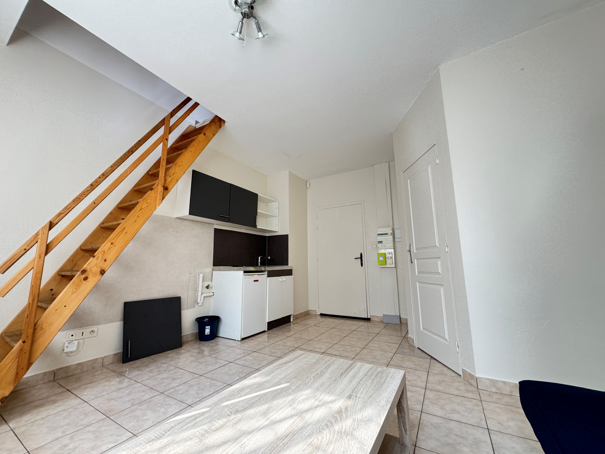 entrée sur coin cuisine (plaques et frigo), séjour, 1 chambre en duplex, salle de douche avec toilettes.