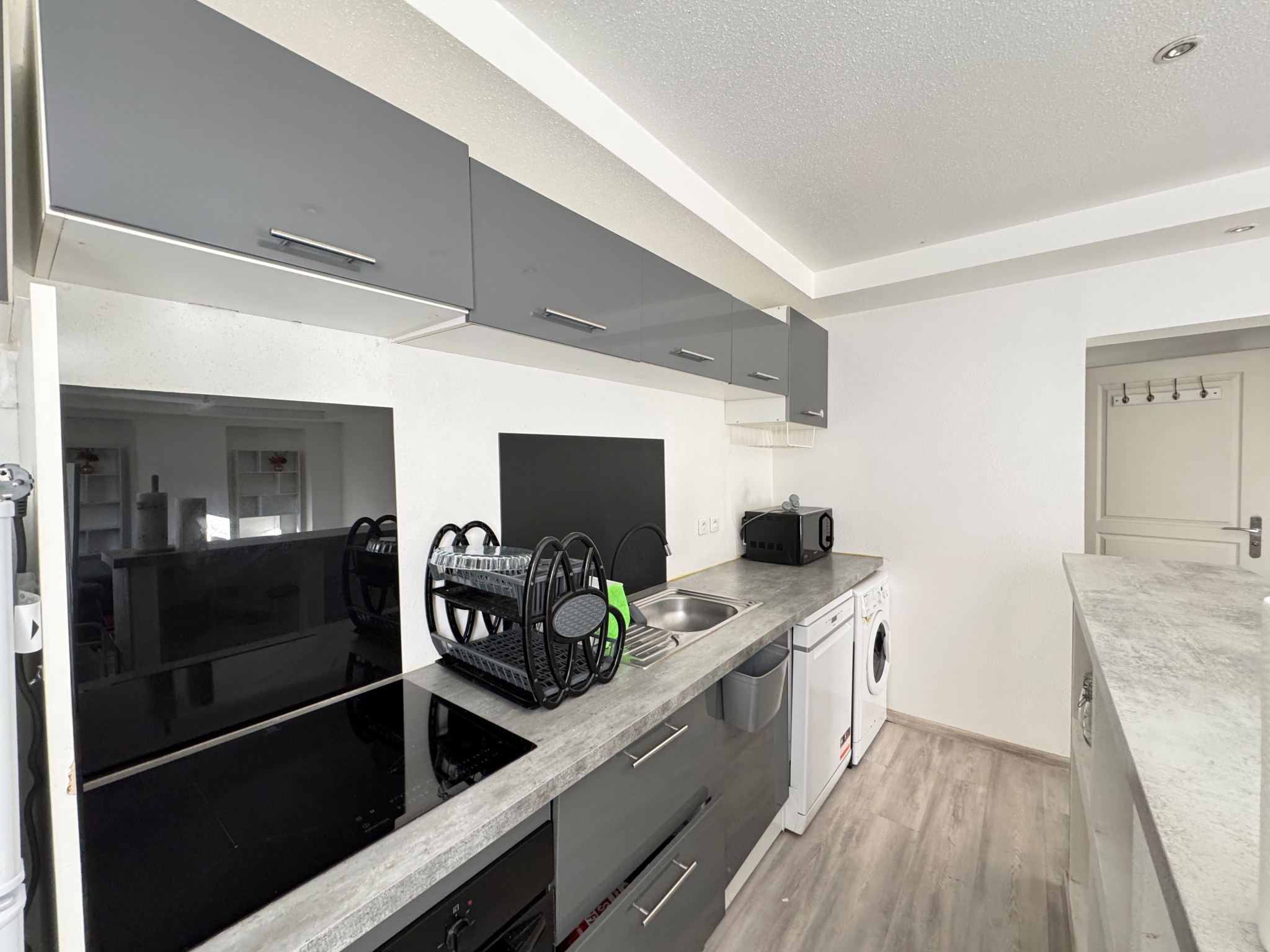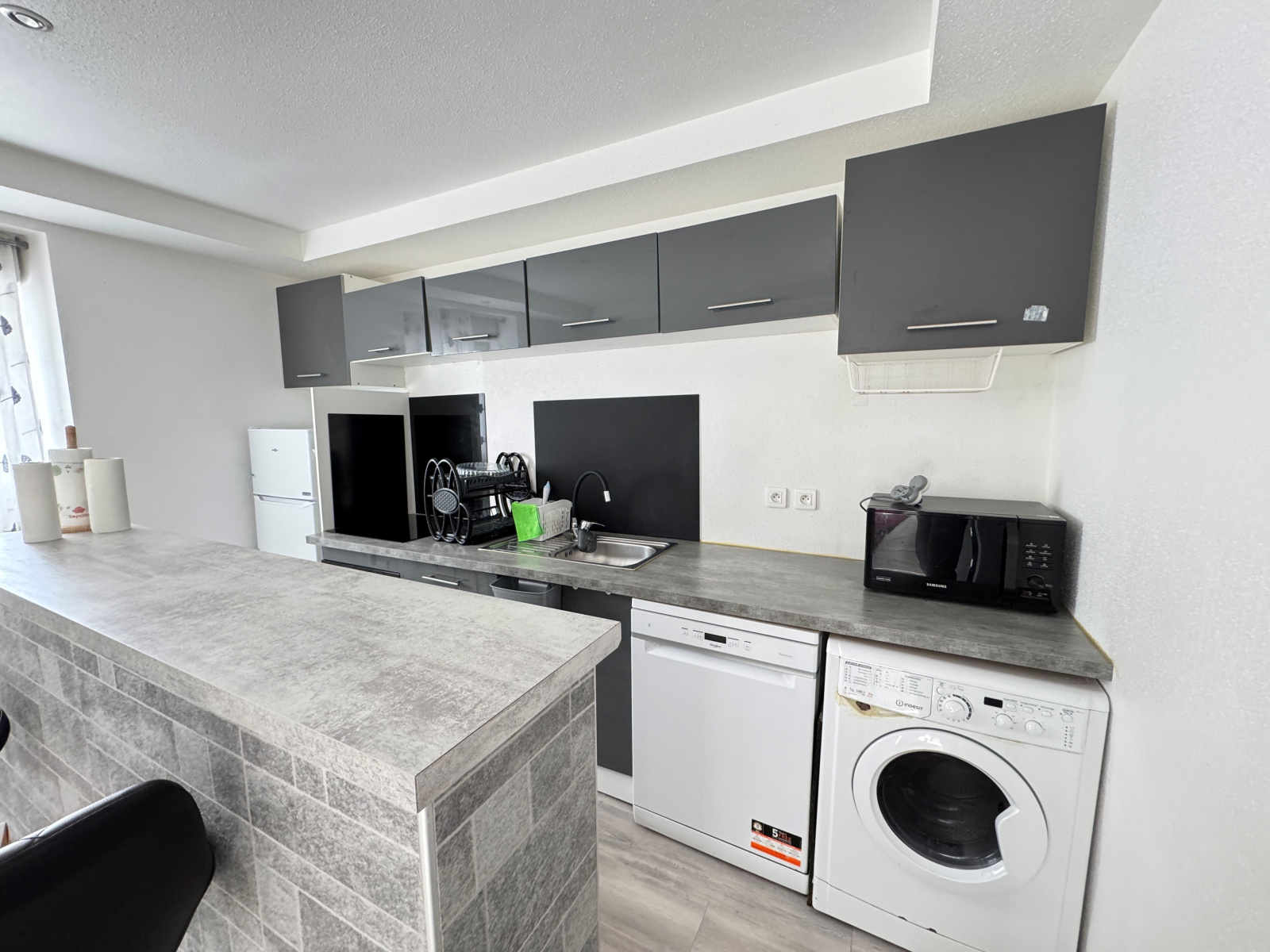 entrée avec placard et débarras, cuisine ouverte équipée (four, plaques, frigo, lave-vaisselle, lave-linge, et éléments), séjour, 2 chambres, salle de douche aménagée avec meuble vasque, placard et toilettes.