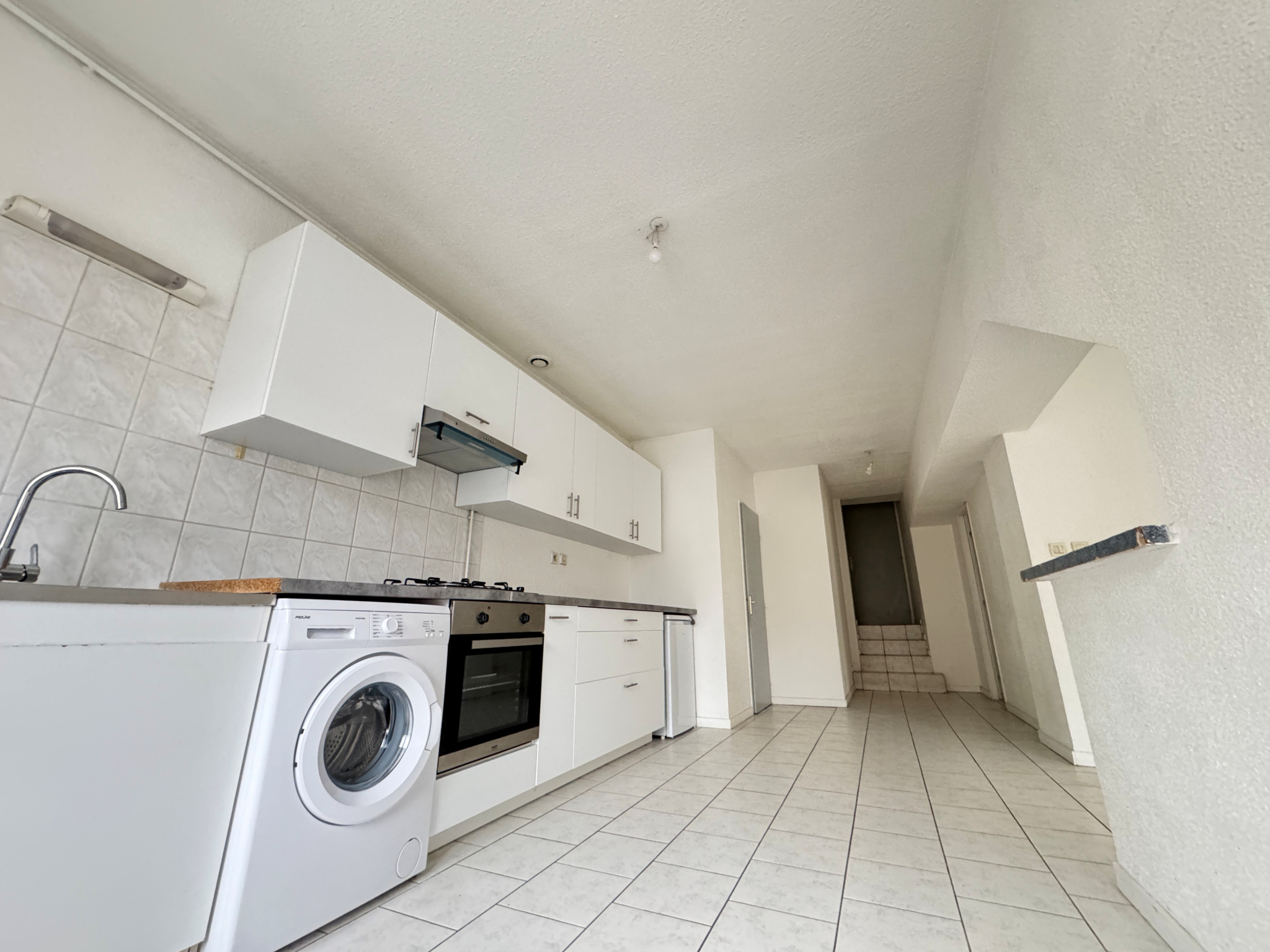 entrée, cuisine équipée (four, plaque, hotte, lave-linge, frigo et éléments), séjour, 1 chambre, salle de bains aménagée avec toilettes.