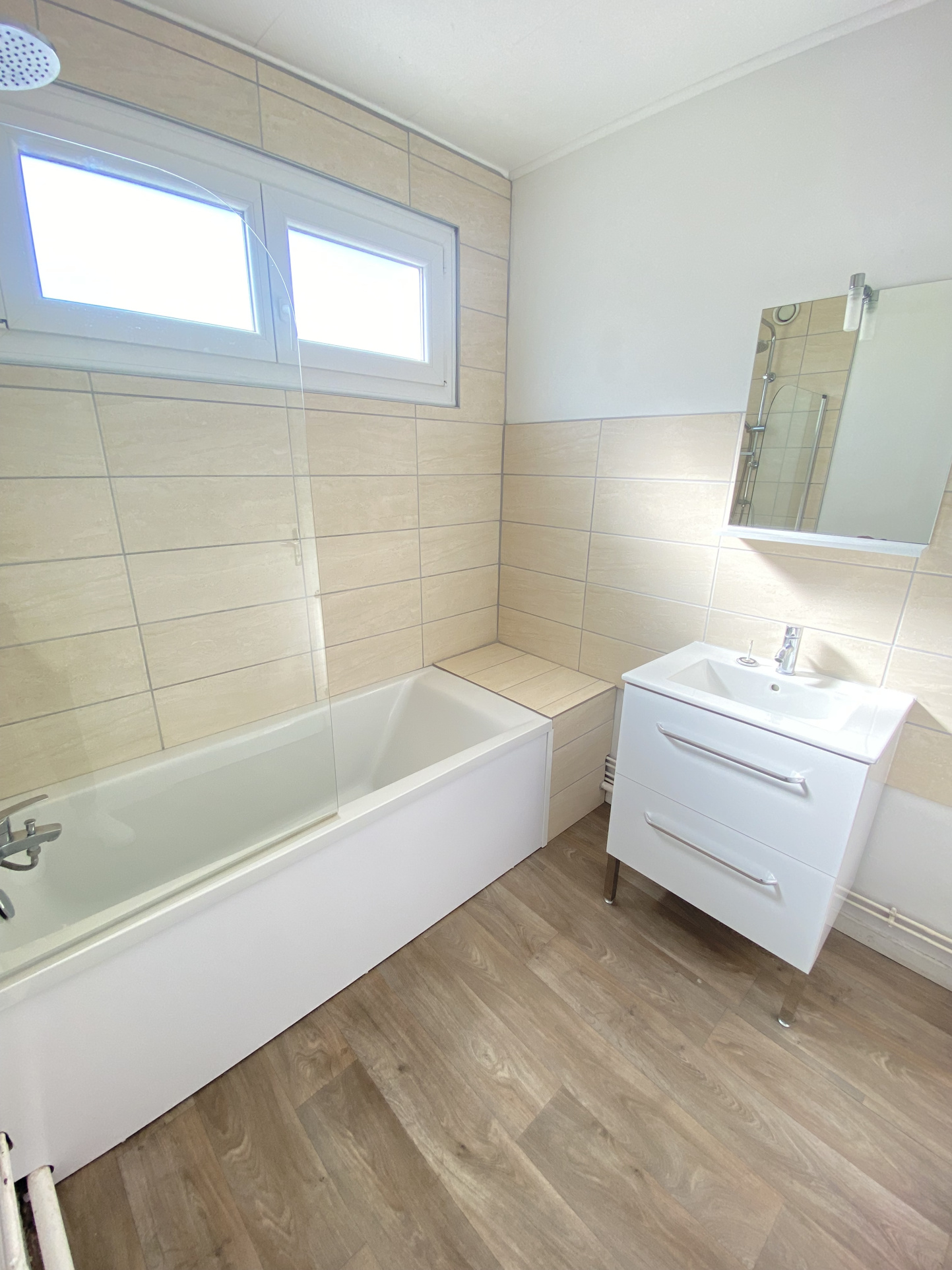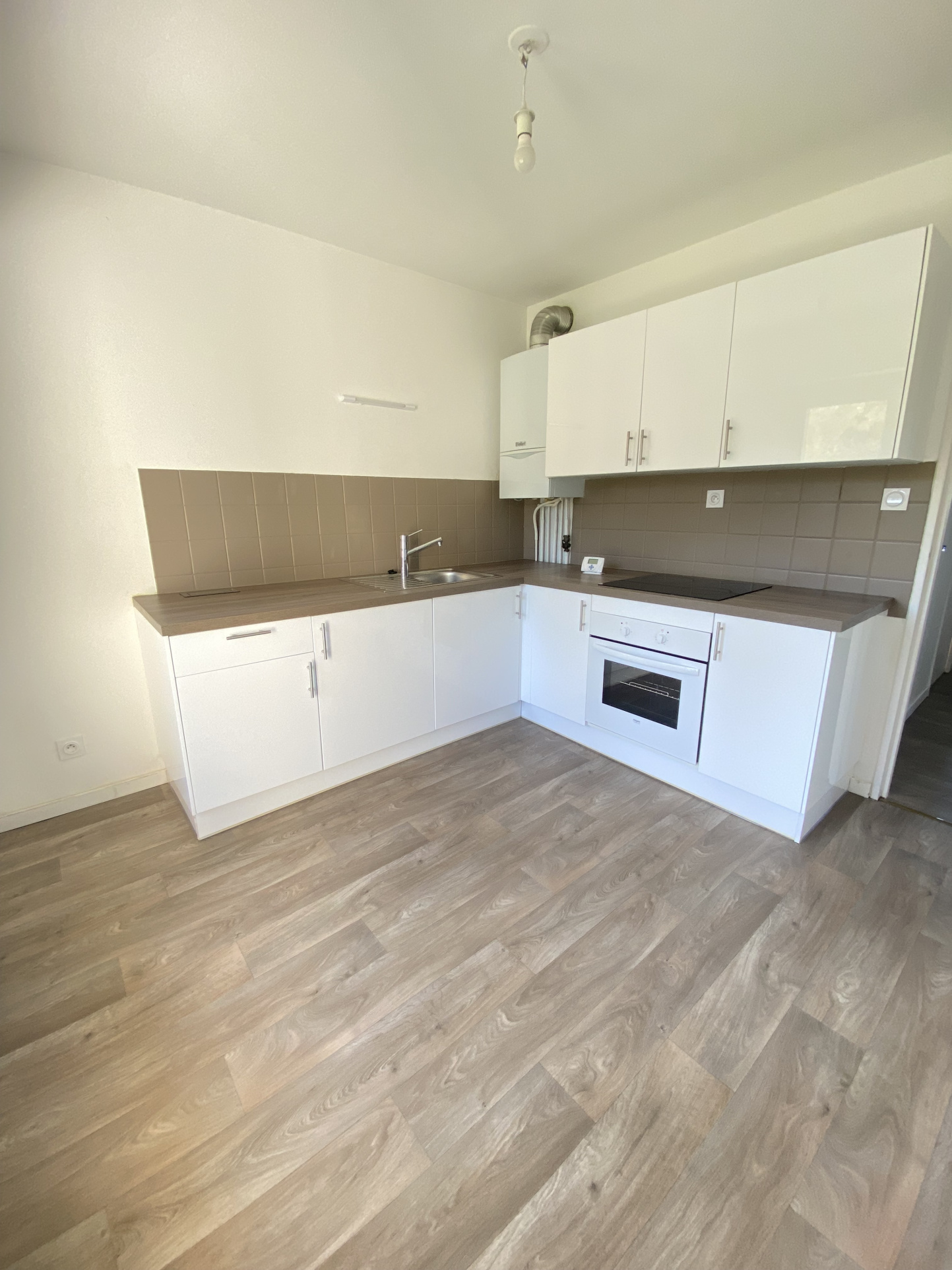 entrée, cuisine équipée (four, plaques, et éléments) avec accès balcon, séjour, 2 chambres, salle de bains aménagée avec meuble vasque et branchement MAL, toilettes.
