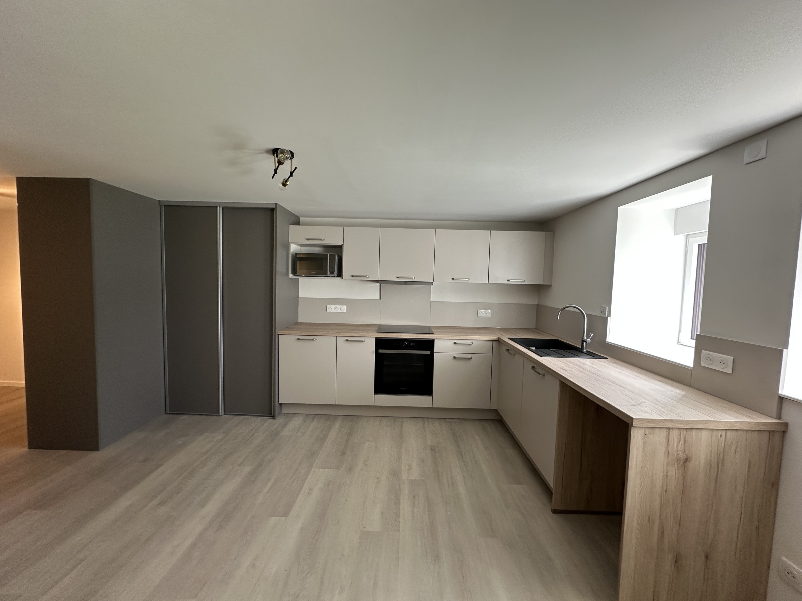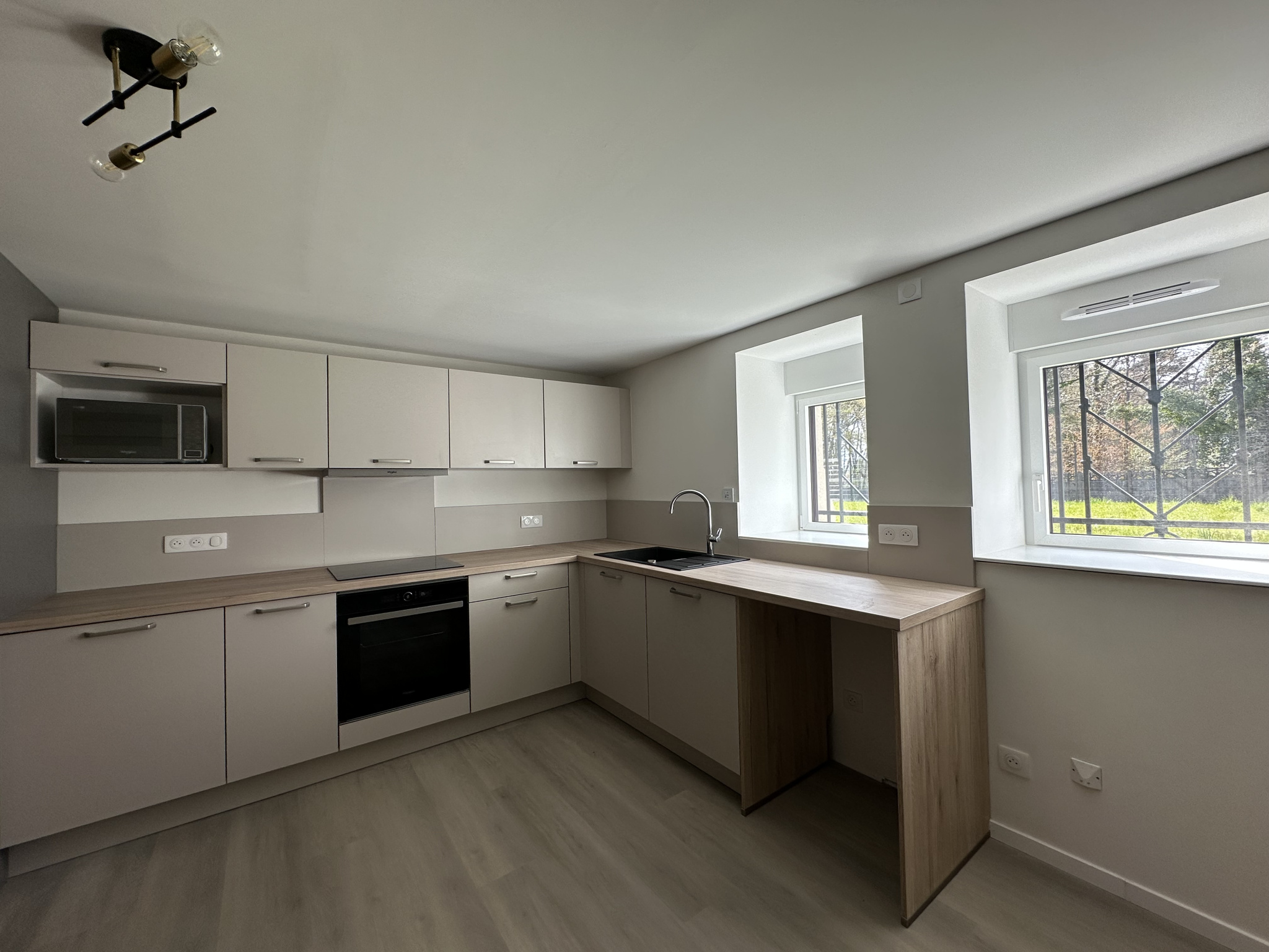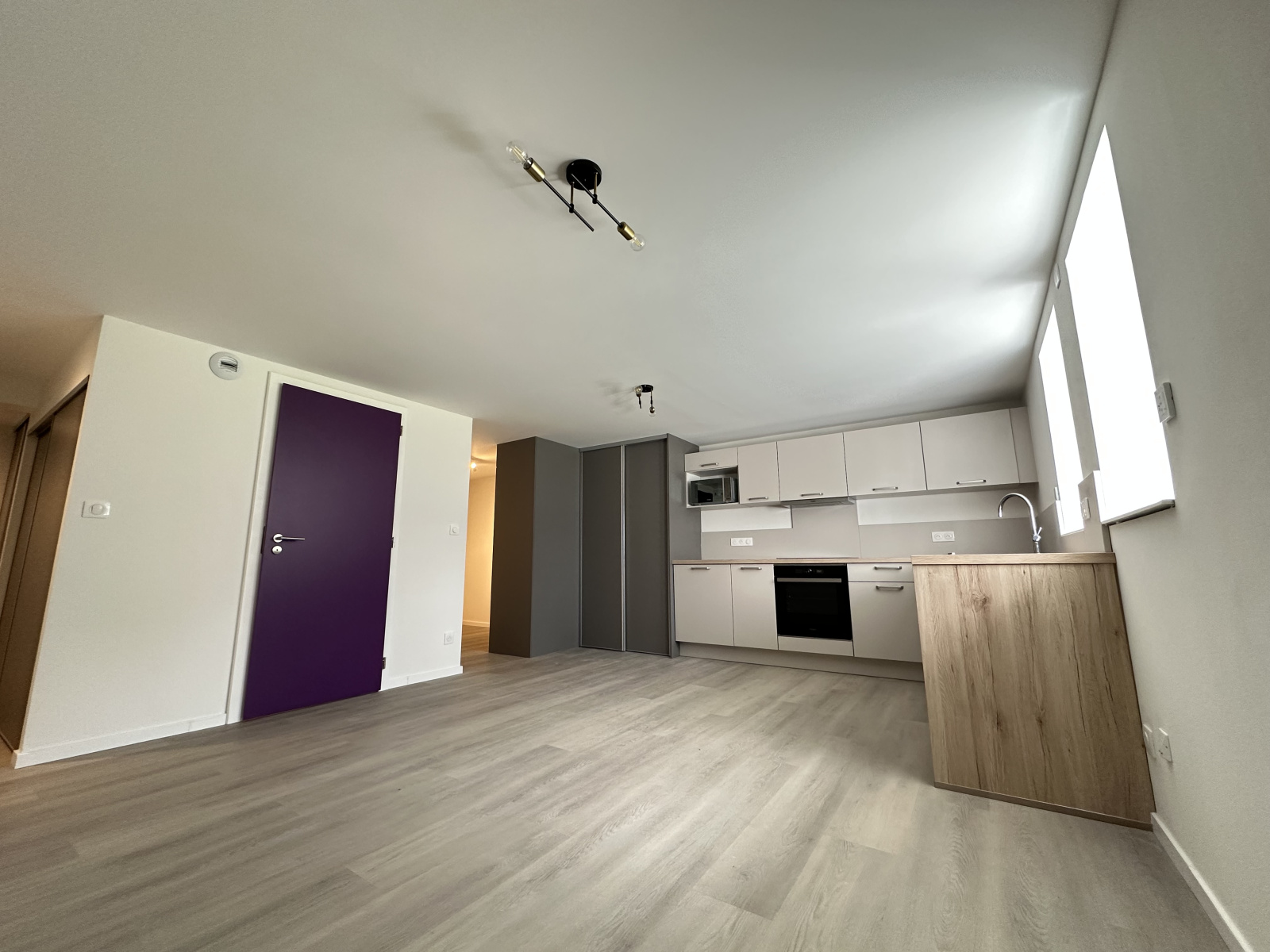 entrée avec placard, cuisine entièrement équipée ouverte (four, plaques, hotte, micro-ondes, lave-vaisselle, branchement MAL et éléments), espace nuit, salle de douche aménagée avec meuble vasque, toilettes et sèche serviettes.