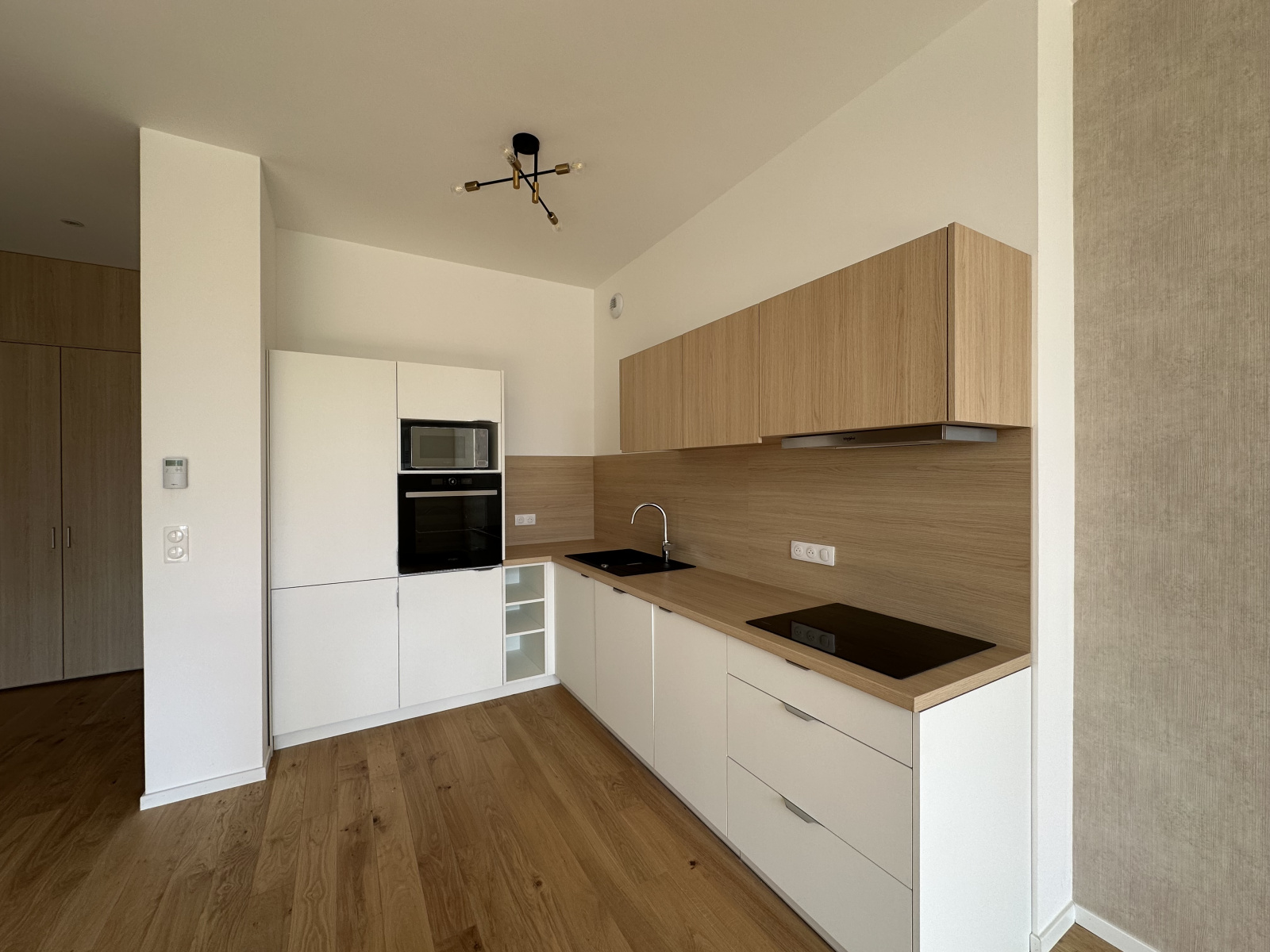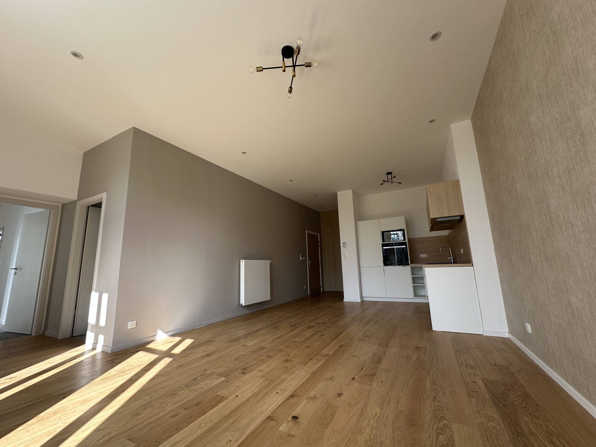 entrée, cuisine entièrement équipée ouverte (four, plaques, hotte, frigo, lave vaisselle, micro-ondes et éléments), salon-séjour, 2 chambres dont 1 avec placard, 2 salles de bains aménagée avec meuble vasque, toilettes, cellier avec branchement lave-linge.