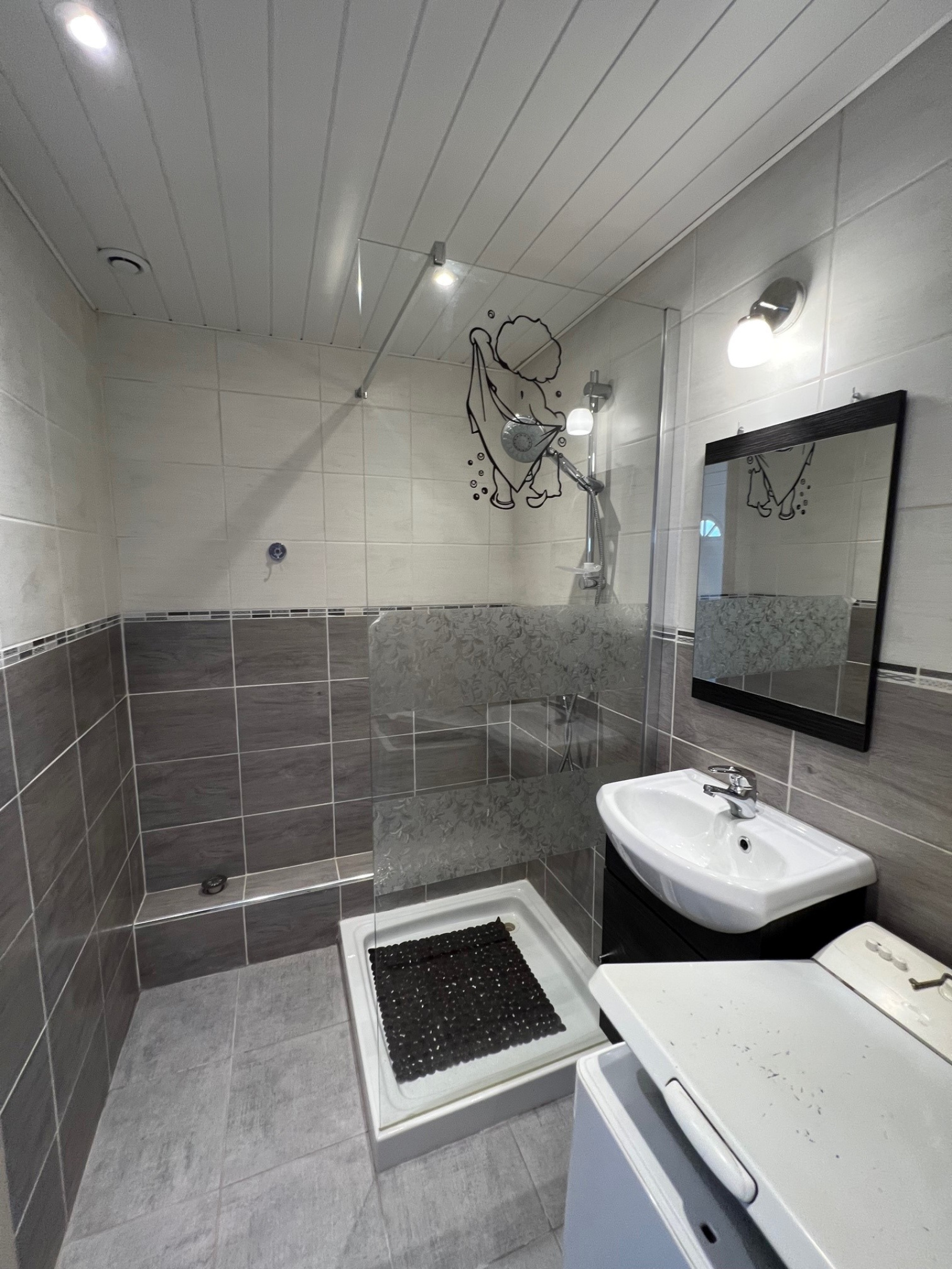entrée, cuisine équipée (four, plaques, hotte et éléments), salon-séjour avec accès terrasse et jardin, salle de douche aménagée avec meuble vasque et toilettes.