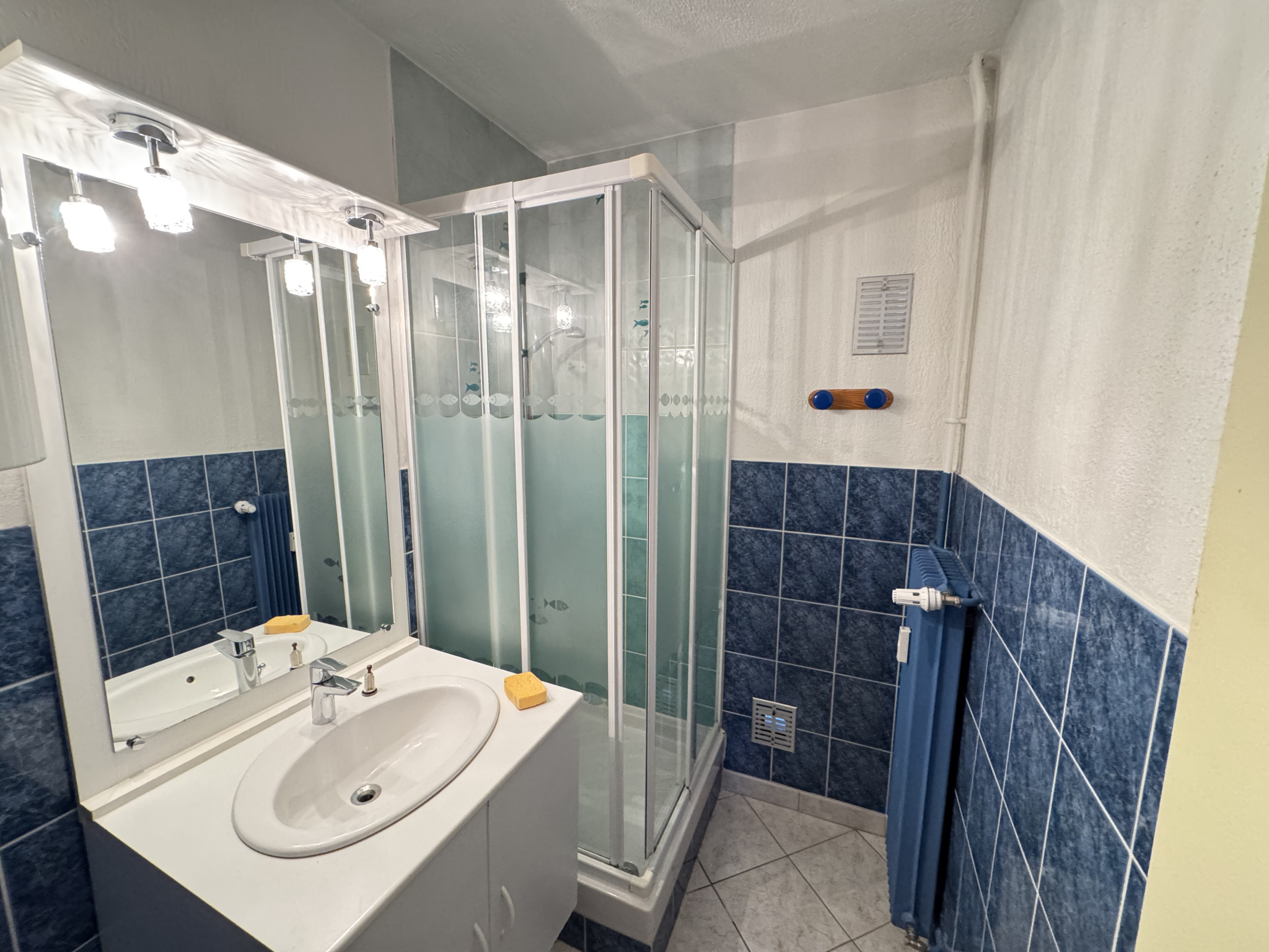 Belle entrée ouverte sur une cuisine équipée, séjour avec balcon et volet électrique, deux chambres confortables avec placards, salle de douche aménagée avec vasque et branchement lave-linge, toilettes.