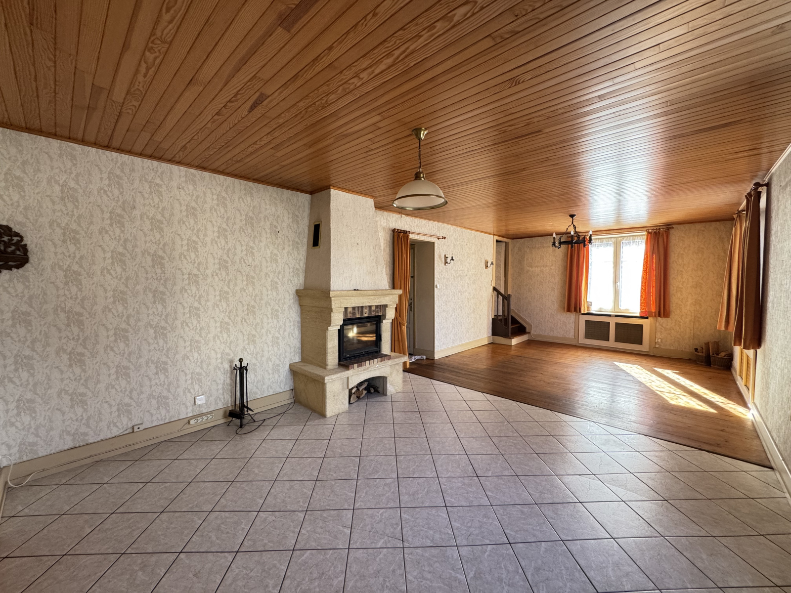 Au rez-de-chaussée : une entrée, un vaste salon-séjour avec insert bois, une cuisine séparée, une chambre, une salle d'eau des toilettes.