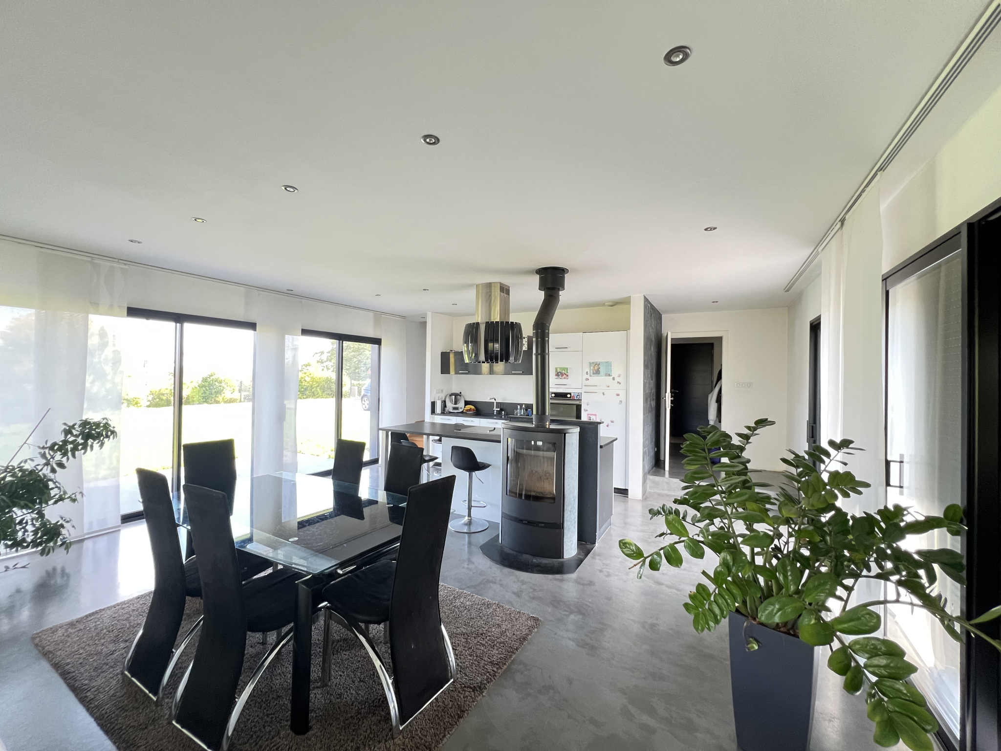 Pièce de vie lumineuse grâce à de grandes baies vitrées donnant accès aux terrasses