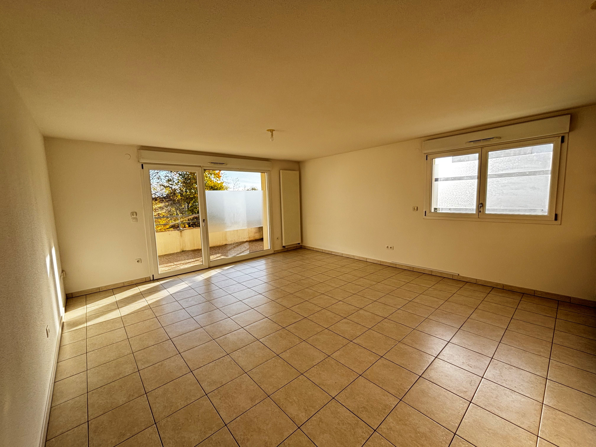 Entrée avec placards sur un bel espace séjour avec cuisine équipée ouverte sur la pièce à vivre et accès sur une grande terrasse au sud,