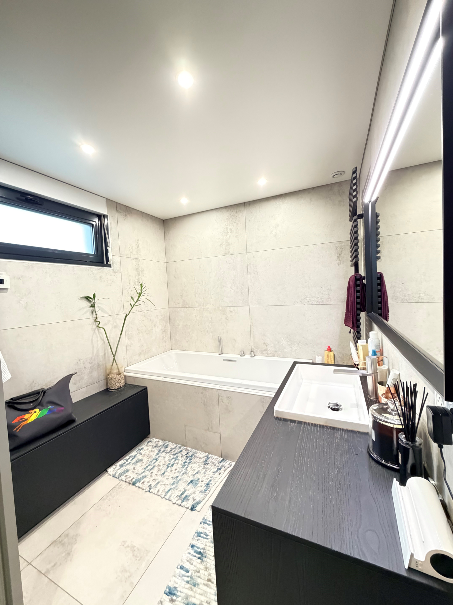 Une cuisine ouverte entièrement équipée, trois chambres dont une suite parentale avec salle d'eau et dressing. Un bureau pouvant faire office de chambre supplémentaire, une salle de bains avec hammam, toilettes, une buanderie avec grenier. Garage attenant.