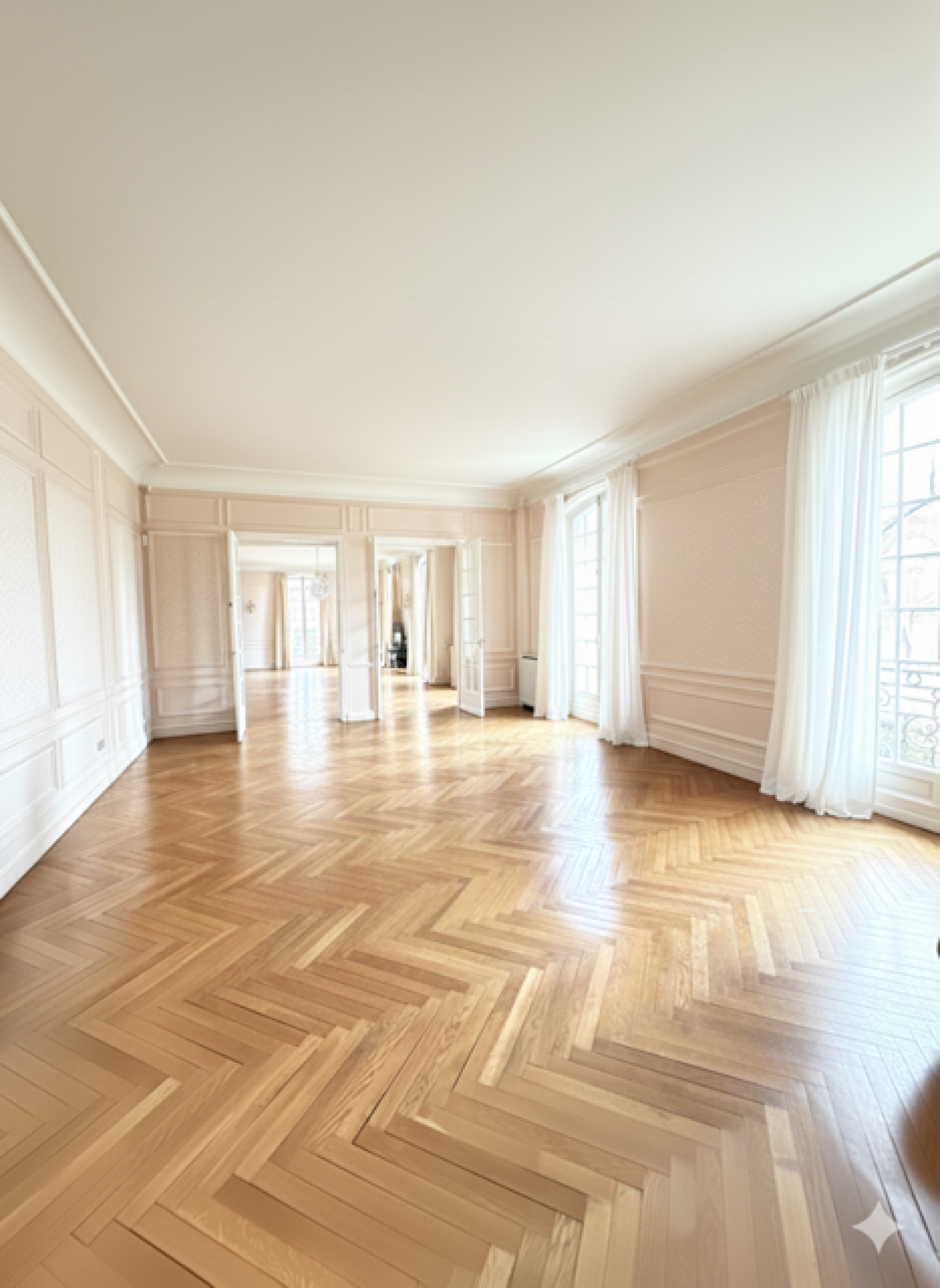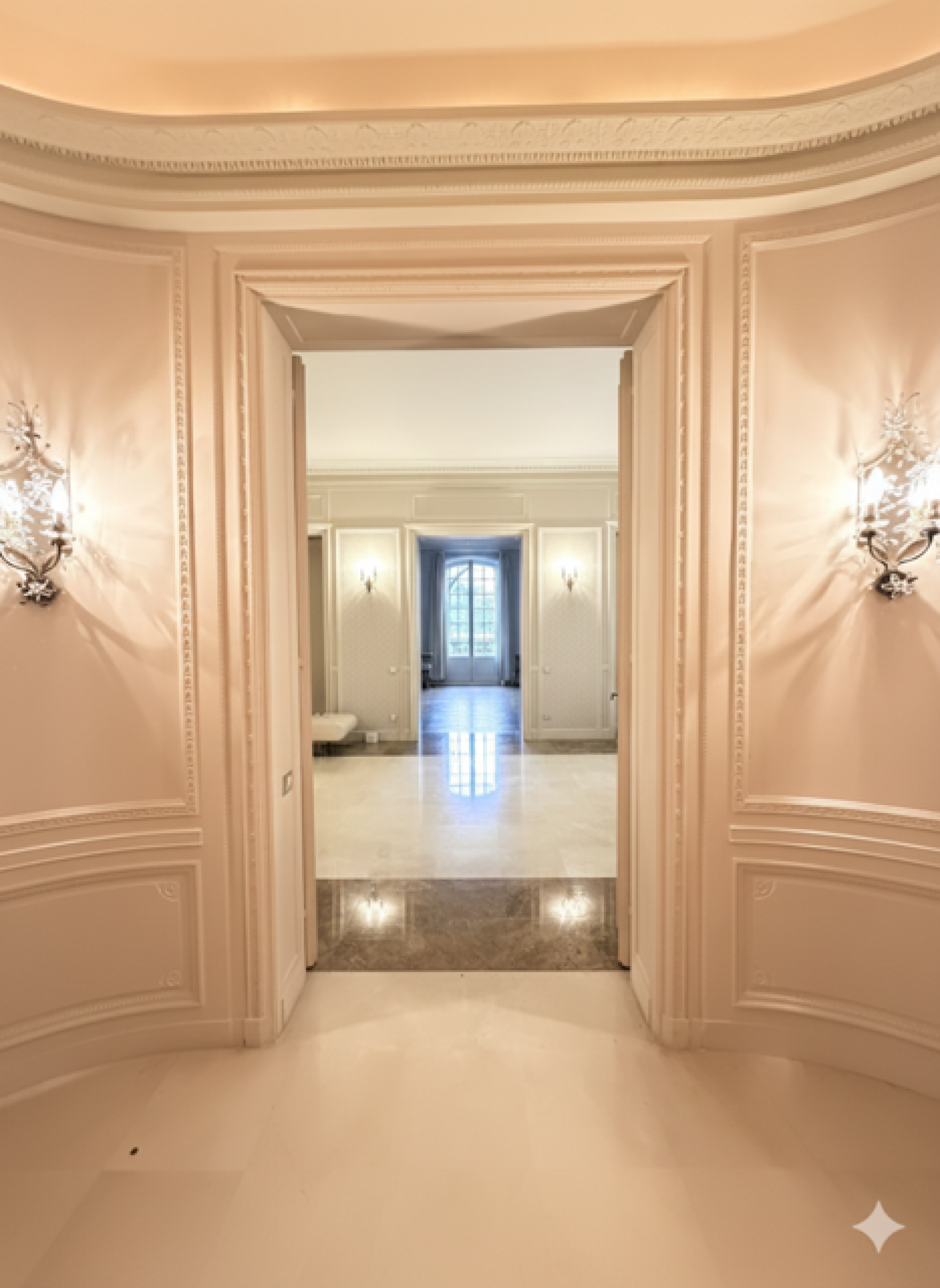 Dès l'entrée un spacieux vestibule mène à un somptueux espace de réception articulé autour de trois salons en enfilade avec en perspective une échappée sur la Tour EIFFEL.